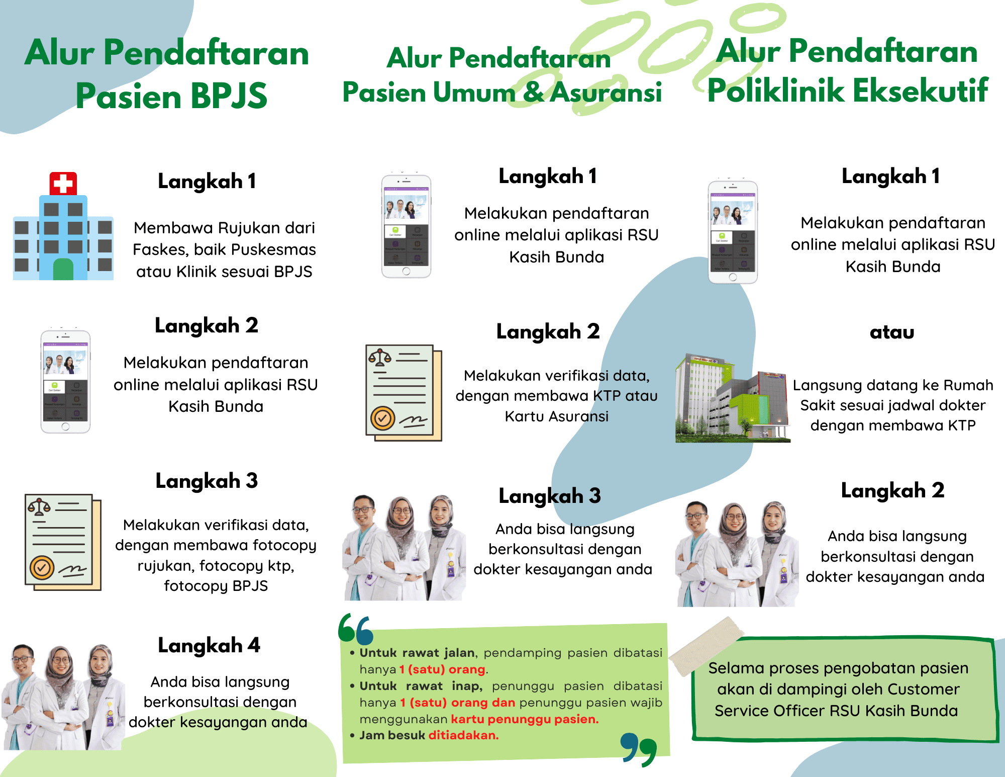 - Untuk pasien Umum pendaftaran bisa dilakukan secara online melalui aplikasi RSU Kasih Bunda yang bisa di download di Play Store atau datang langsung ke Rumah Sakit